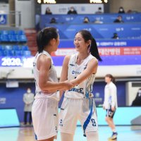 - 2020.11.25 | 루키더바스켓 - 은행 2020-2021 여자프로농구’ 인천 신한은행과 아산 우리은행의 경기가 열렸다. 우리은행 79:48로 대승을 거뒀으며, 박지현과 오승인이 미소를 지으며 이야기를 나누고 있다.